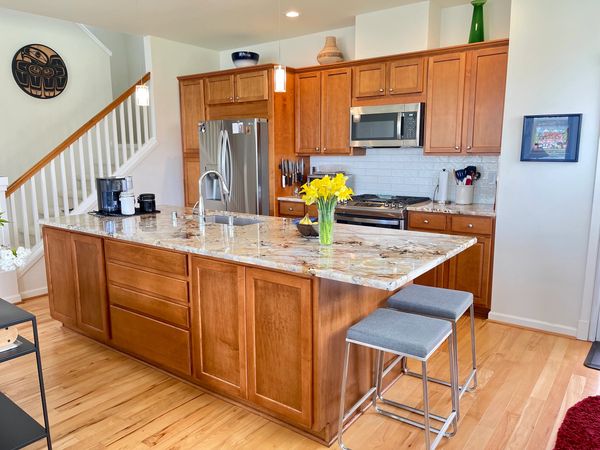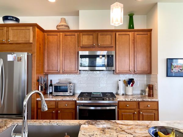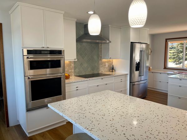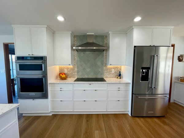 This beautifully remodeled kitchen blends functionality with contemporary elegance. Featuring custom white cabinetry with sleek hardware, the space offers ample storage and a clean, cohesive aesthetic.