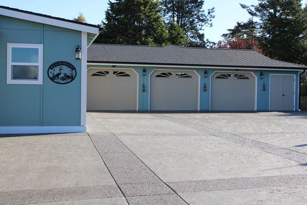 This project showcases a beautifully executed coastal-style exterior, featuring a three-car garage integrated seamlessly with the overall home design. The exterior is finished in a serene ocean blue with crisp white trim, evoking a relaxed beach house ambiance.