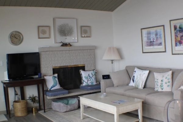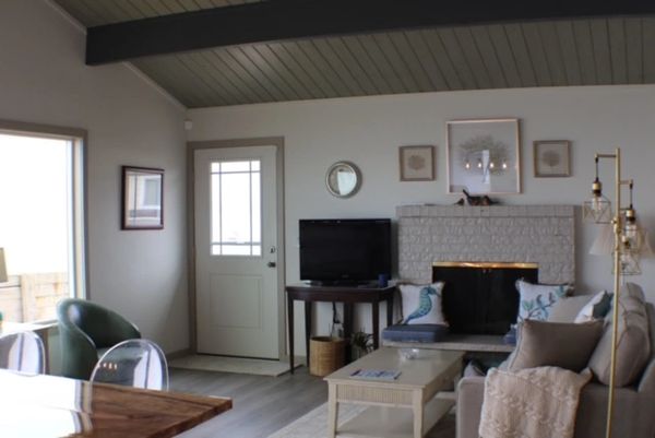 This inviting beach house exemplifies the perfect blend of coastal charm and modern sophistication. Featuring vaulted ceilings with exposed beams and a muted green wood-paneled finish, the space offers an open, airy atmosphere ideal for relaxion.