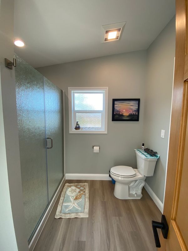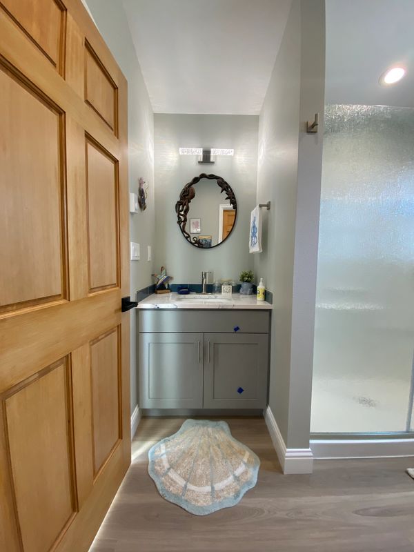 Modern guest bathroom featuring a custom wood vanity with marble countertop. Includes a spacious walk-in shower with a frosted glass enclosure